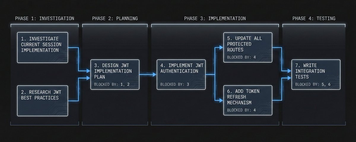 1. Volles Dependency Management: Tasks können andere Tasks blockieren. Claude beginnt keine Arbeit, die von unfertigen Voraussetzungen abhängt.