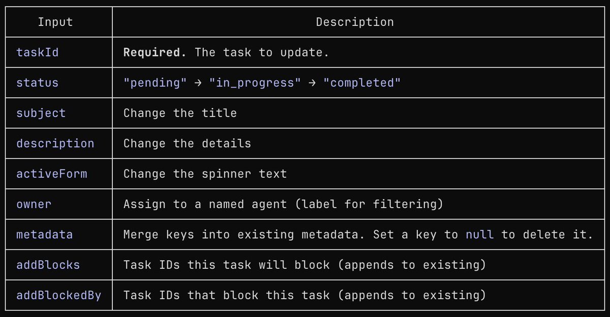 Modifiziert einen existierenden Task (Status, Owner, Abhängigkeiten).