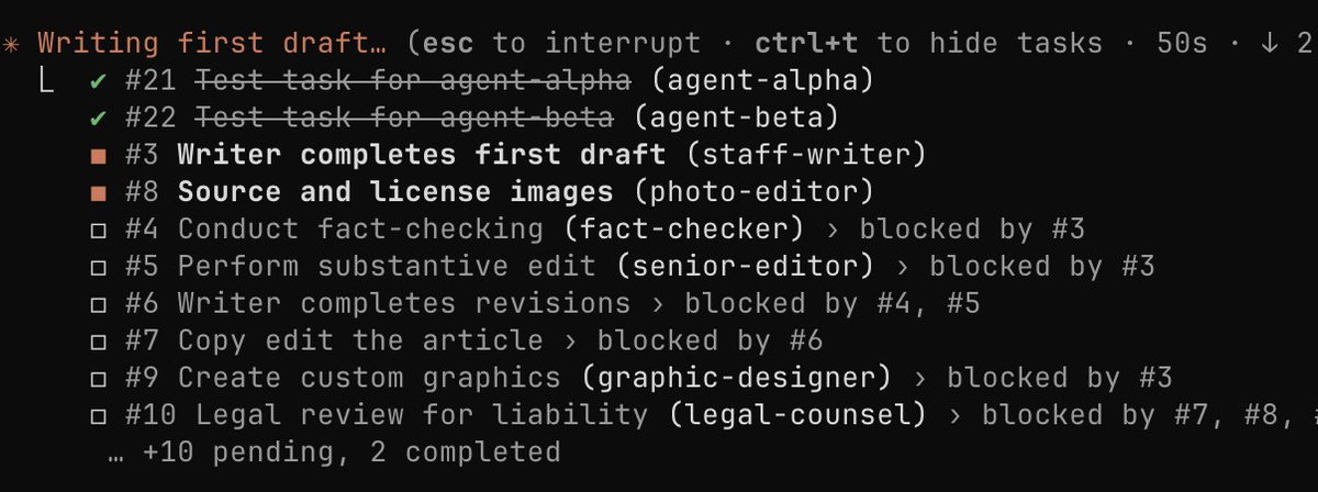 Parallele Agenten: Claude kann mehrere Agenten in einer einzigen Nachricht spawnen. Sie laufen gleichzeitig und aktualisieren dieselbe Task-Liste ohne Konflikte.